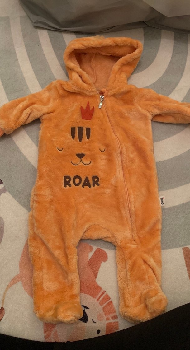 1 kez kullanıldı. Kahverengi bebek tulumu, yumuşak ve sıcak kumaş, renkli baskılar ve kürk detaylara sahiptir. Kapüşonlu ve fermuarlı, önünde "ROAR" yazısı bulunur.