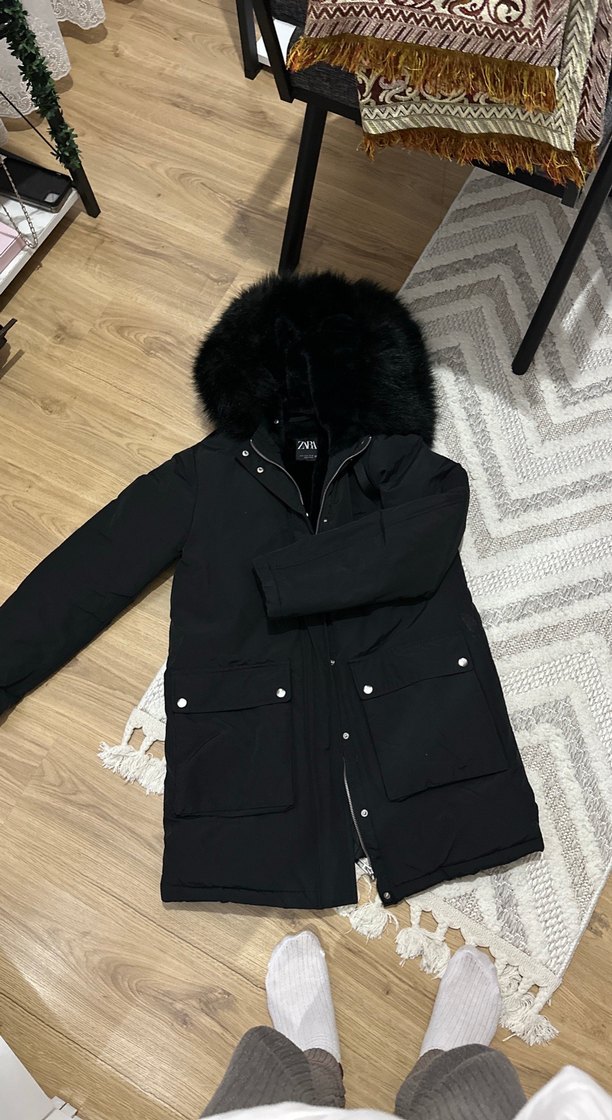 Kürklü kapüşonlu, uzun kollu, siyah kadın kışlık mont. Yumuşak ve sıcak kumaştan üretilmiş, midi boyda ve rahat kesimdir. Sorunu yoktur bir defa giyildi