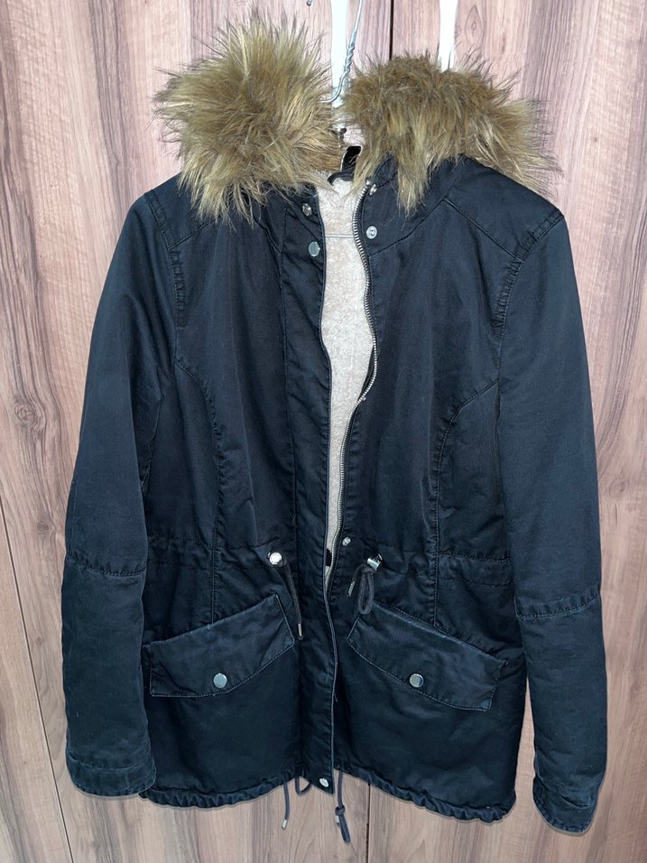 Kürklü kapüşonlu, uzun kollu siyah kadın mont. Yırtık veya söküğü yoktur.
