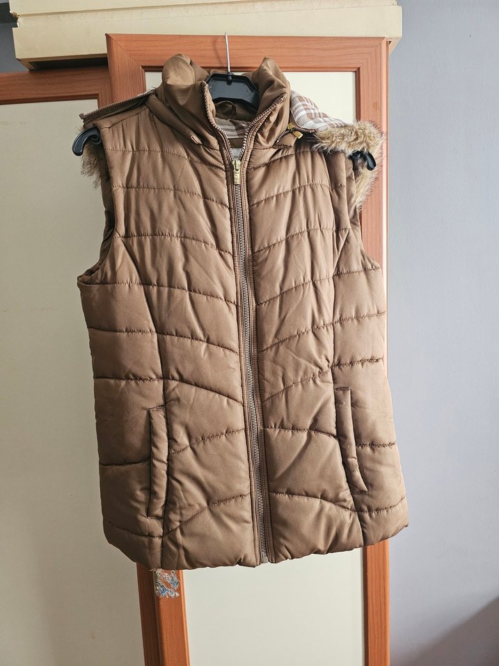 Kürklü detaylı, kahve renkli, kolu olmayan ve önden fermuarlı kadın yelek. Yumuşak sentetik kumaştan yapılmış, rahat ve günlük sokak stili için uygun.