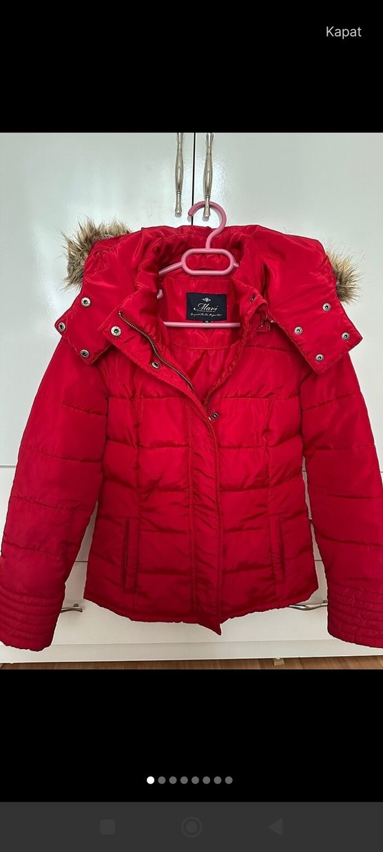Kürklü kapüşonlu, parlak kırmızı kısa kesim, dar kesim kadın kışlık mont. Sokak stiline uygun, rahat ve dış mekan kullanımı için ideal.
