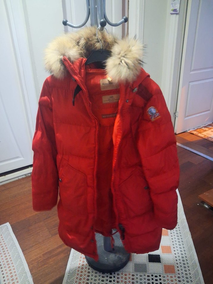 Kürklü kapüşonlu, parlak kırmızı renkli, uzun kollu ve normal boyda, yumuşak ve sıcak kumaştan yapılmış kadın kışlık mont. Az kullanılmış yeni gibidirr