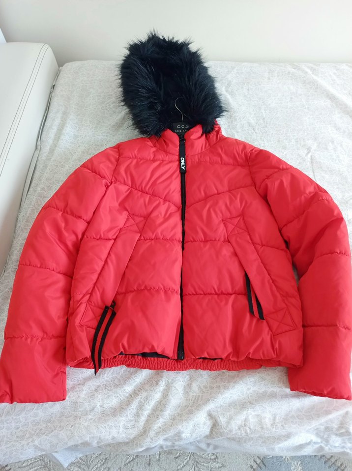 Kürklü kapüşonlu, yüksek yakalı, kırmızı renkli, uzun kollu, normal midi boyda, yumuşak ve sıcak kumaştan kadın kışlık montu