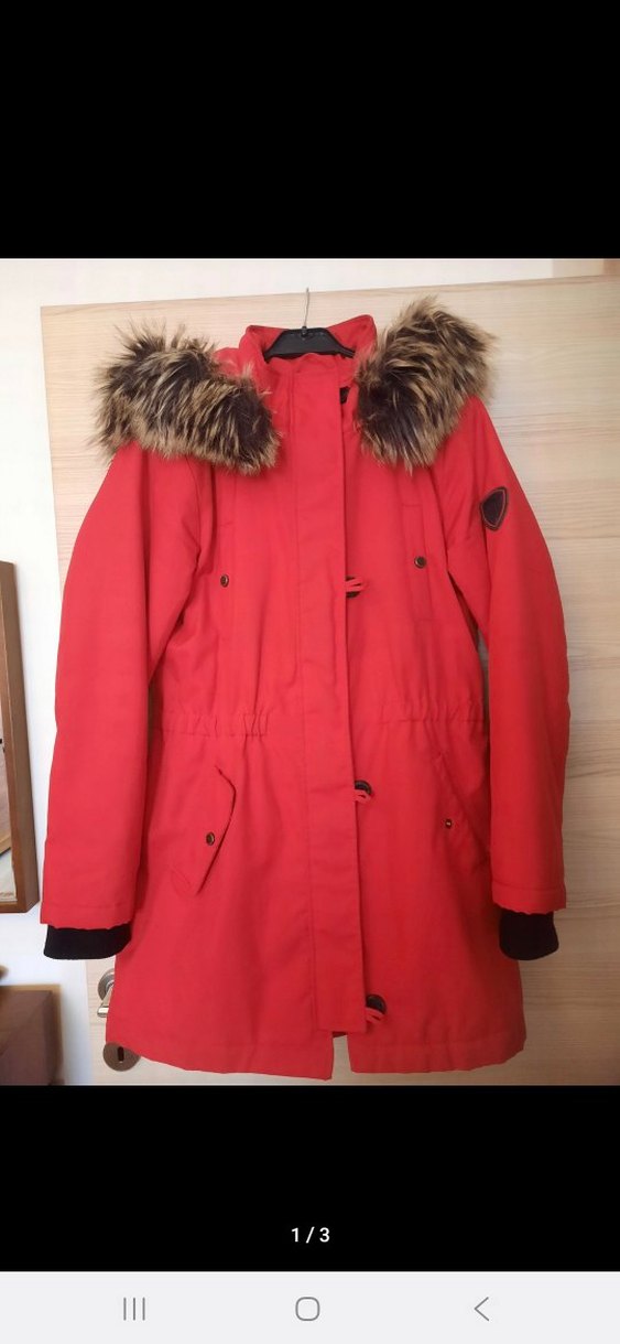 Bu kırmızı kadın kışlık mont, kürklü yakaya ve kesik yakaya sahiptir. Yumuşak ve sıcak kumaştan üretilmiş, uzun kollu ve midi boydadır.