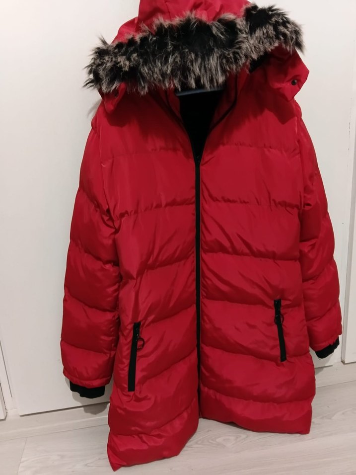 Kürklü kapüşonlu, kırmızı fitted kadın kışlık mont. Uzun kollu, midi boyda, yumuşak ve sıcak kumaştan outdoor kullanım için uygun.