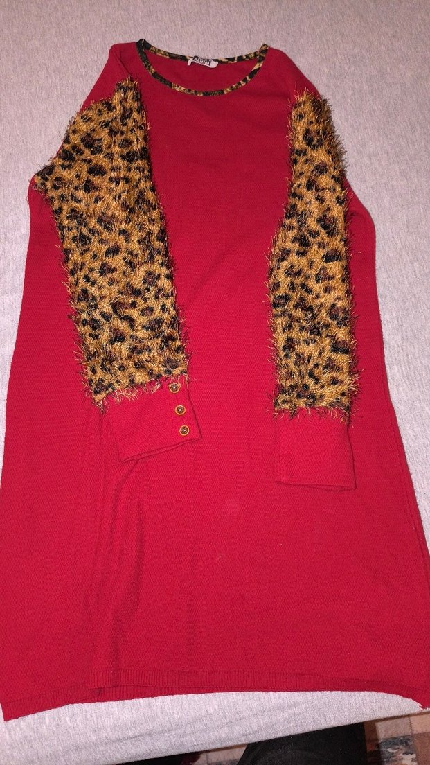Kırmızı midi boy triko elbise, uzun kollarda leopar desenli kürk detayına sahip. Salaş kesim ve yuvarlak yaka ile renkli, rahat bir sokak stili sunar.