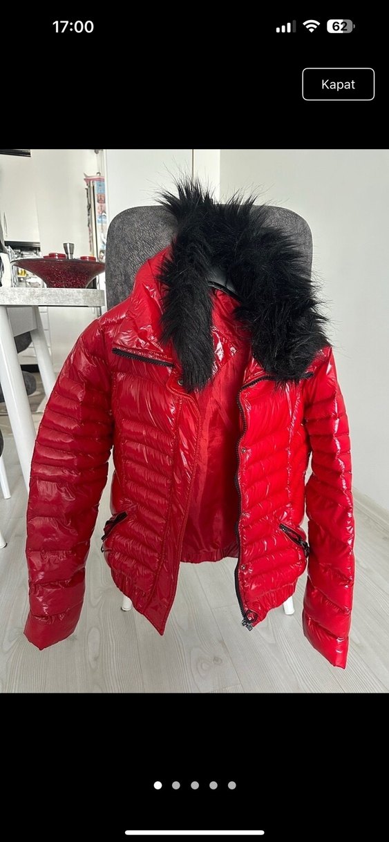 Kürklü detaylı, kısa kesim ve yakalı kırmızı kadın kışlık mont. Yumuşak sentetik kumaştan, sokak stili için uygun. ❄️