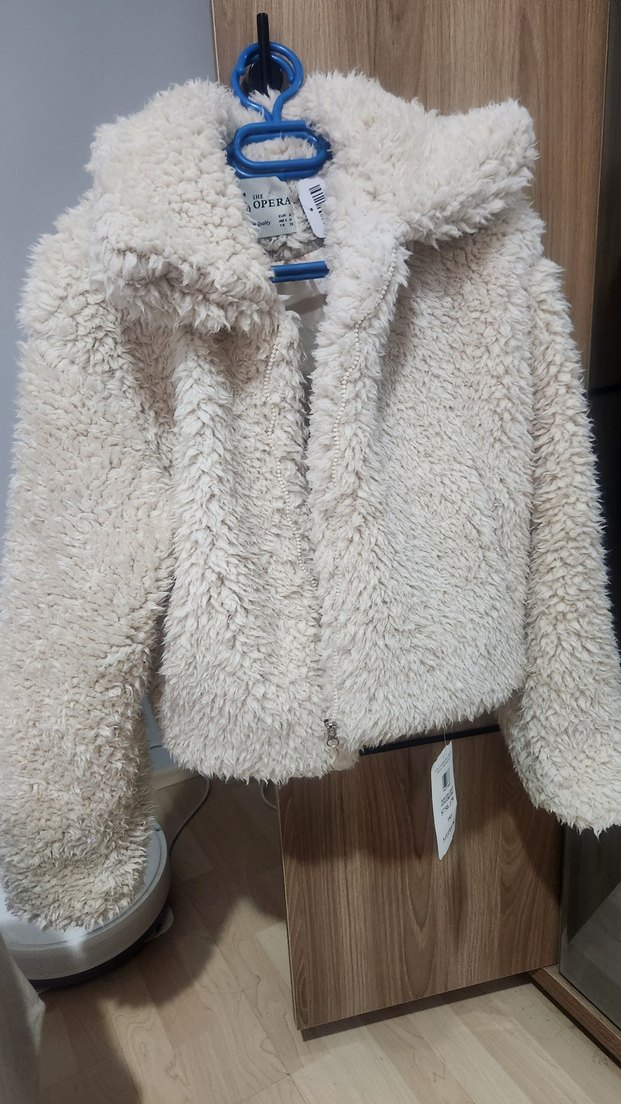 Kürklü detaylı, kısa bej kışlık mont. Yumuşak ve sıcak fleece kumaştan, uzun kollu ve oturan kesimle genç ve rahat tarz için uygundur.