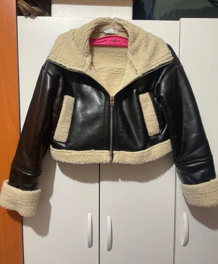 siyah deri ceket, uzun kollu ve yüksek yakalıdır. Yaka, cep ve manşetlerde kürk detayları bulunur. Kısa boyu ve desensiz tasarımıyla rahat sokak stili için uygundur.