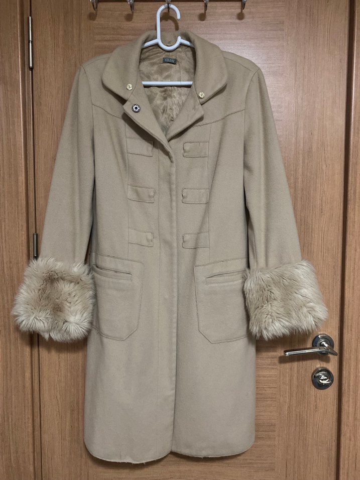 Bej renkli kaban, kürklü kol detayları ve düğmeli ön kapamaya sahiptir. İki ön cepli ve şık yakalıdır.