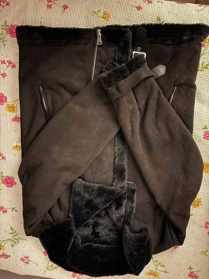 Kürklü detaylara ve kapüşona sahip, koyu kahverengi süet, normal boy, dar kesim kadın ceket. Sokak modasına uygun ve rahat.
