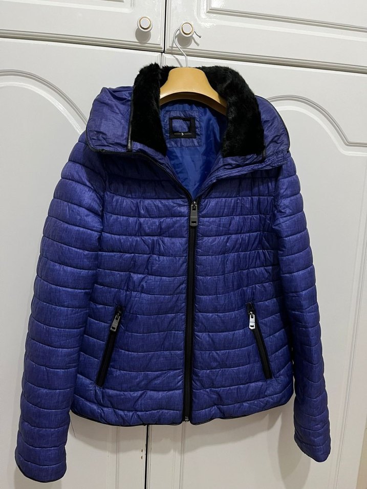 Kürklü detaylı, lacivert, fitted kesim kadın ceket. Notch yaka ve uzun kollu, midi boyda, yumuşak ve sıcak kumaştan üretilmiştir.