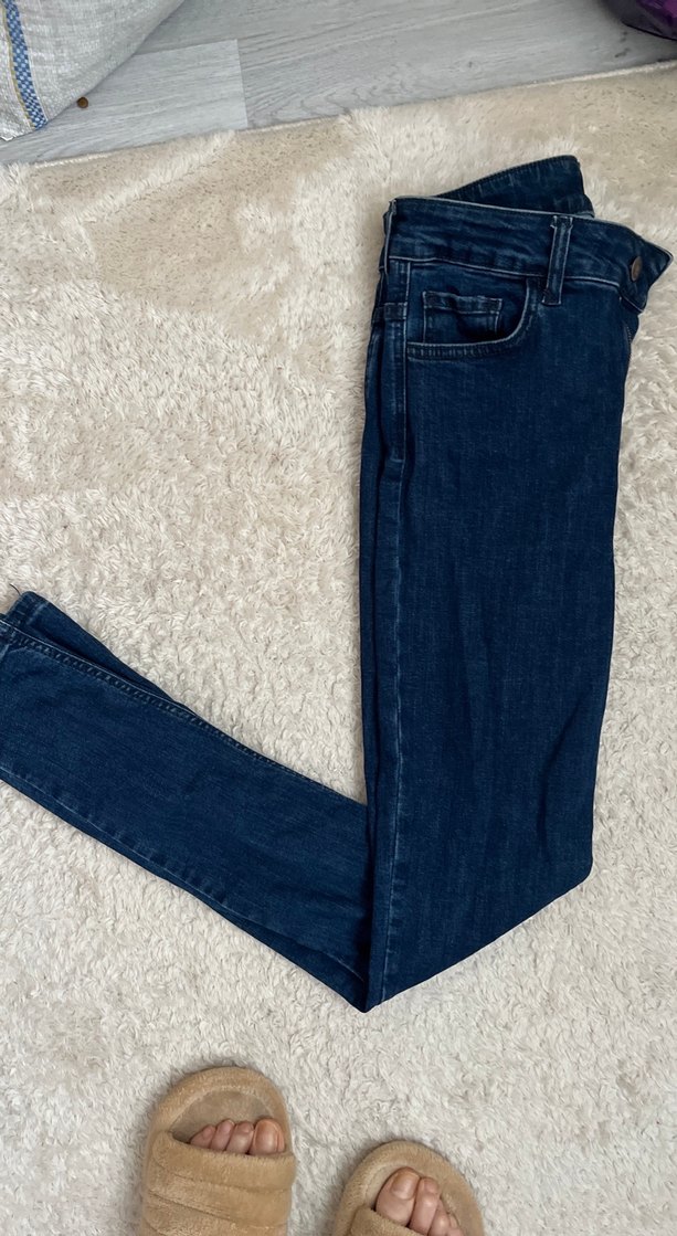 Kürklü detaylı, lacivert renkte, normal kesim midi boy kadın denim pantolon. Rahat ve gündelik kullanıma uygun.