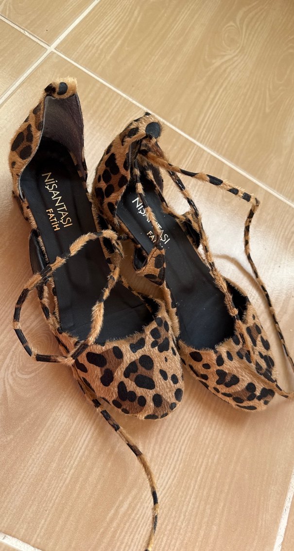 Kahverengi süet kadın hasır topuklu ayakkabılar, leopar desenli ve kürklü detaylıdır. NiSANTASI imzalı, bohem ve şık bir tarz sunar.