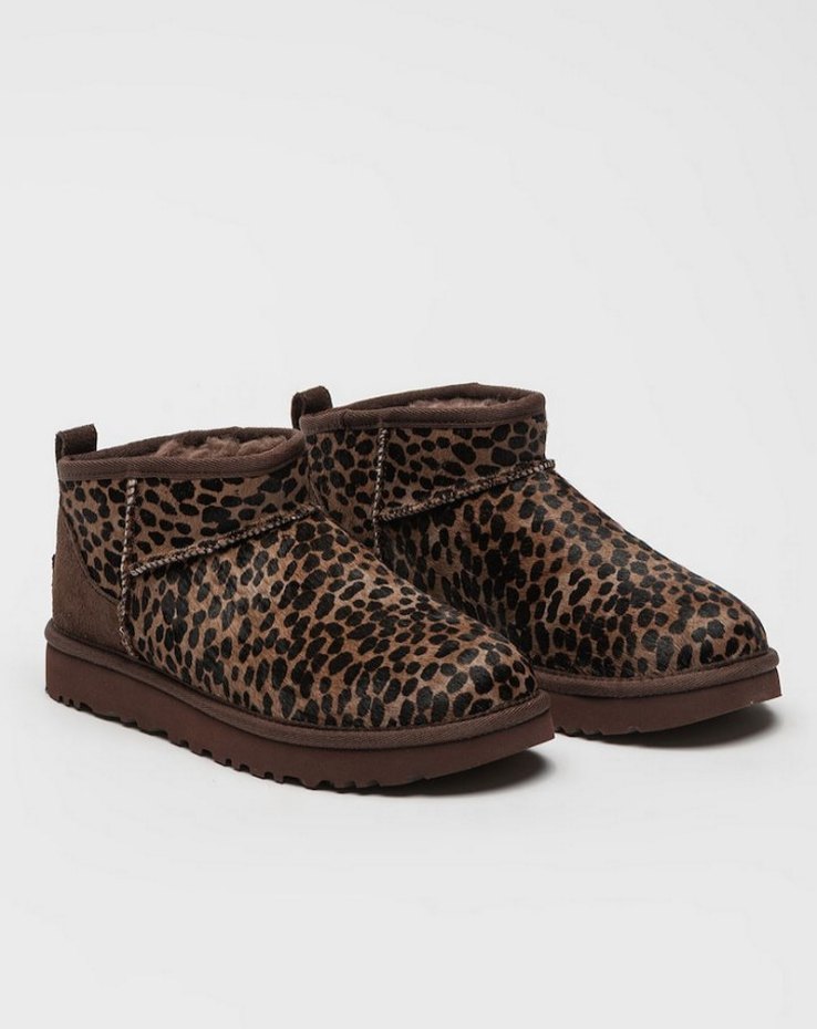 Kahverengi süet kadın botlar, leopar desenli ve dolgu topukludur. Kürklü detayları sıcaklık ve rahatlık sağlar, günlük sokak modasına uygundur.