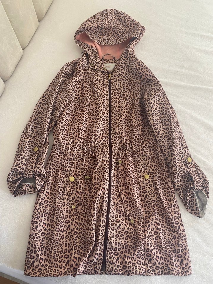 Uzun, bol kesim kadın yağmurluğu leopar desenli ve kürk detaylıdır. Kapüşonlu ve uzun kolludur, sentetik kumaştan yapılmıştır, rahat sokak stili için uygundur.