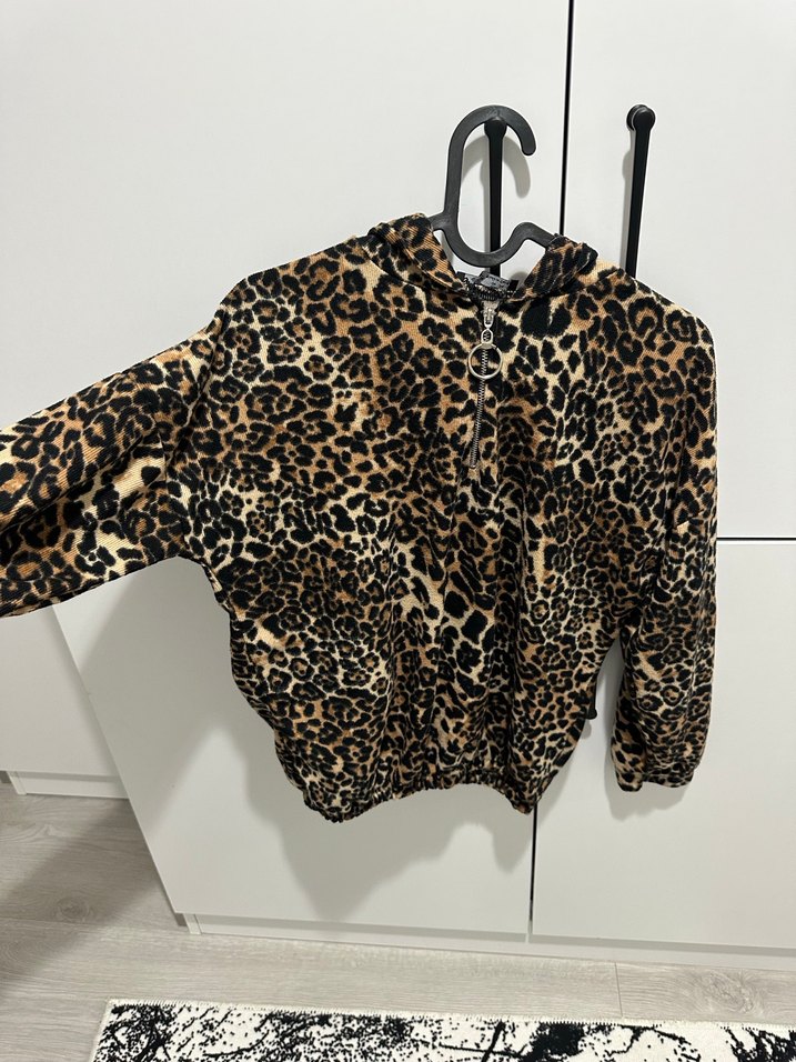 Kahverengi leopar desenli sweatshirt, kürklü kapüşon ve uzun kolludur. Bol kesim, kısa boy ve yumuşak, sıcak kumaştan üretilmiştir. Rahat sokak stili için uygundur.