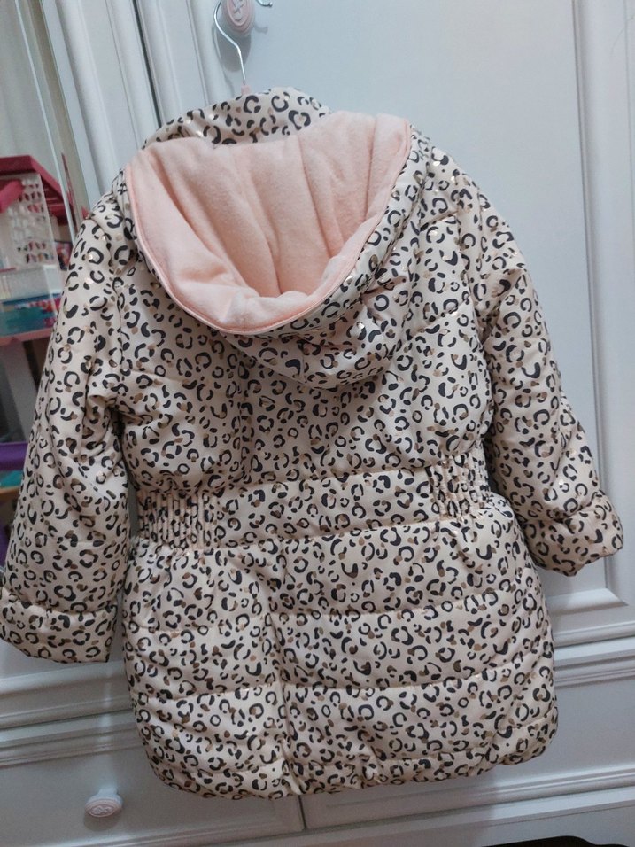 Kürklü detaylı, kapüşonlu ve leopar desenli kız çocuk montu, yumuşak ve sıcak kumaştan üretilmiştir.