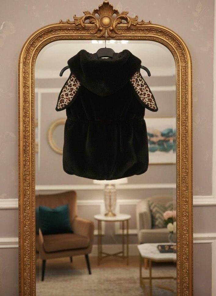Kürklü detaylı, leopar desenli siyah kolsuz yelek. Kapüşonlu ve kısa kesim, günlük kullanım için uygun.Sayılı giyildi iyi durumda..