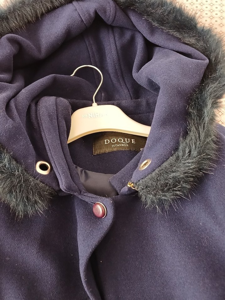 Kürklü kapüşonlu, koyu lacivet renkte, notched lapel yakalı, uzun kollu, rahat ve sıcak dokulu kaban armineden alinmis çok yeni kg nedeniyle giyemedim