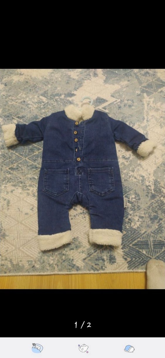 Bu bebek tulumu denim kumaştan, yakada, kollarda ve paçalarda kürk detaylıdır. Düğmeli ön ve arkada iki cep bulunur. ❄️