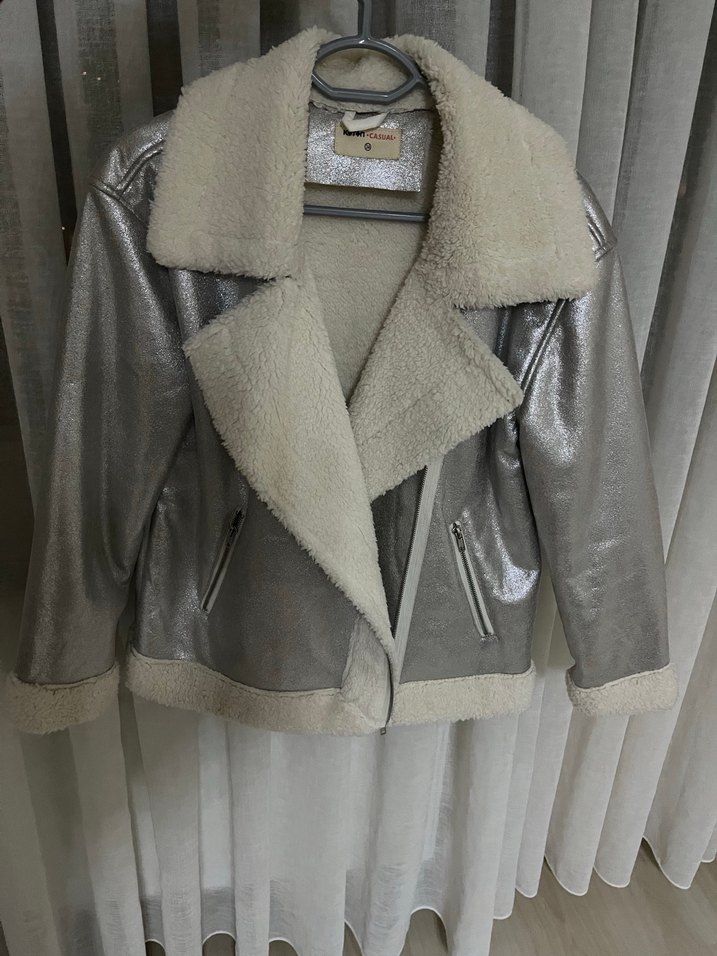Gri deri kadın ceket, kürklü yakası ve manşetleriyle rahat bir görünüm sunar. Kısa kesim ve dar kalıp, sokak stiline uygundur. Sadece 1 kez giyildi.