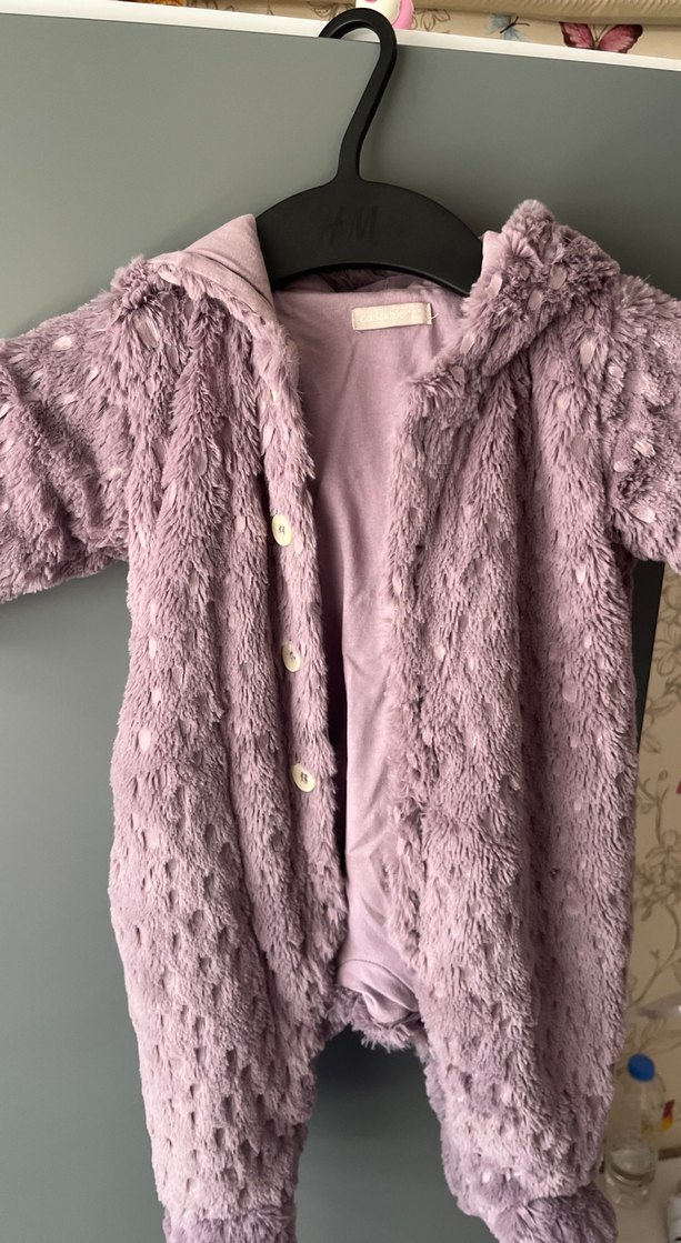 Mor renkli, kürklü dokulu ve yakalı bebek tulumu. Düğme kapamalı, desensiz ve rahat bir yapıya sahiptir. ❄️