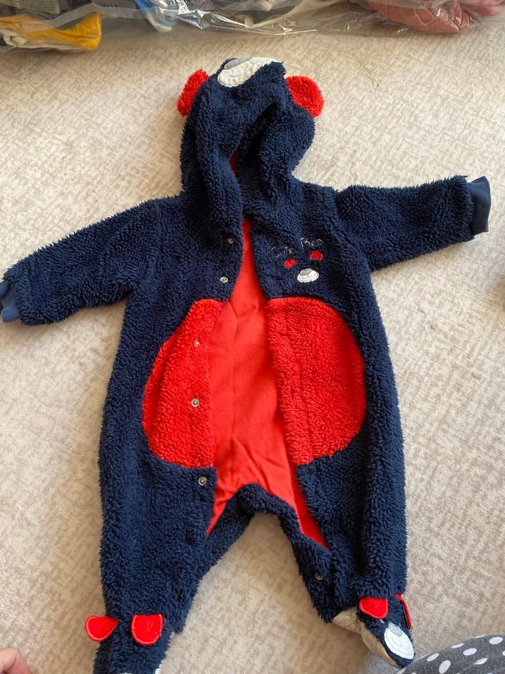 Koyu mavi renkli bebek tulumu, yumuşak ve sıcak kumaş, kürk detayları ve nakışlı desenlere sahiptir. 0-3 ay. Tertemiz