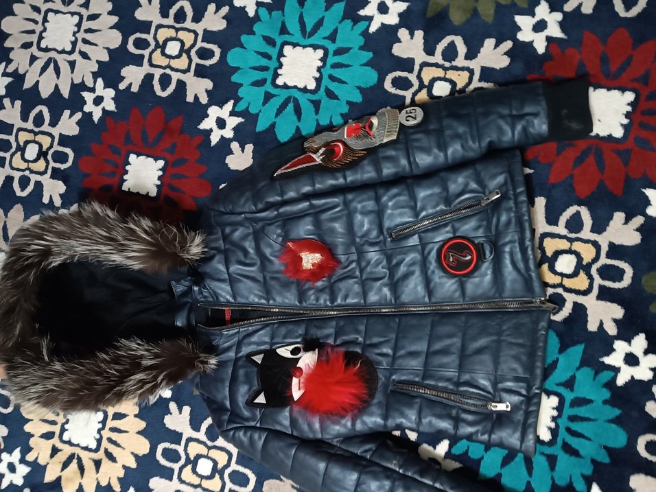 Fıtilli, kısa boy mavi deri ceket, nakışlı desenler ve kapüşon ile göğüste kürk detayları içerir. Rock punk tarzı ve dış mekan kullanımı için uygundur.S bedendir