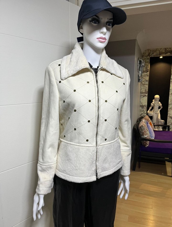 Uzun kollu, düğmeli beyaz kadın ceket. Nakışlı desenli, yumuşak ve rahat dokulu, normal kesim ve midi boyda. ✨ #kürk #peluşkürk #kaban #peluşmont #bikermont #bikerkürk MARKA TEMSİLİDİR
