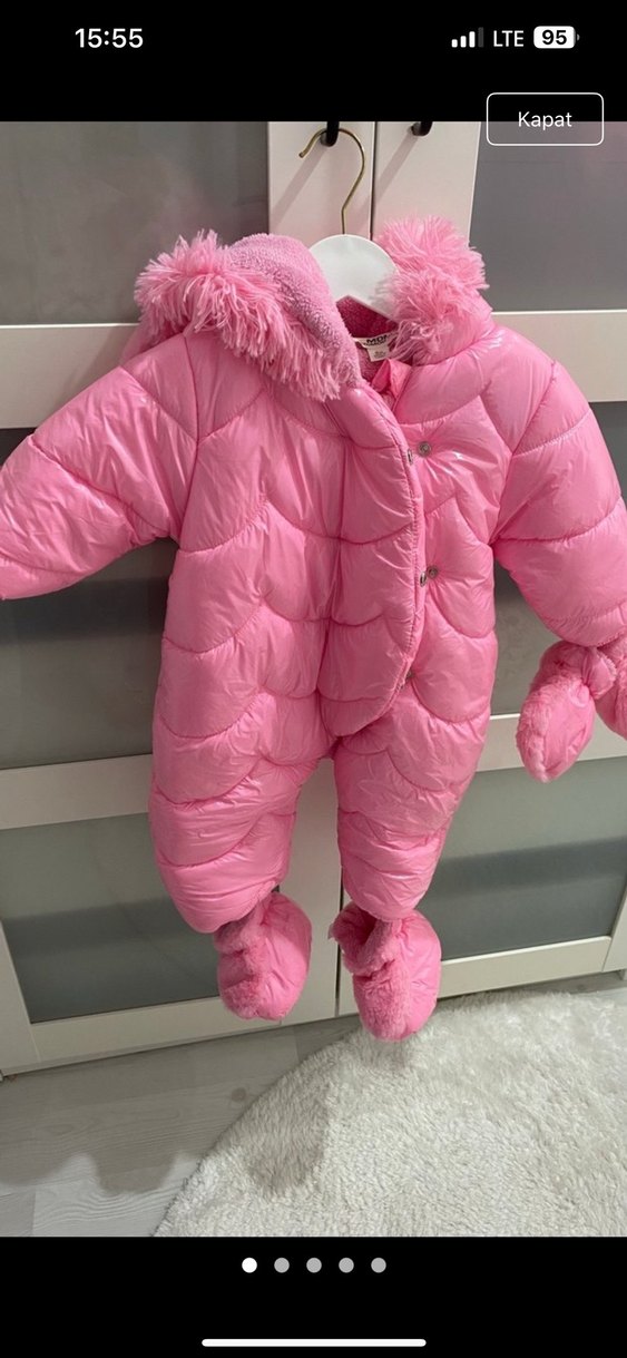 Kalıbı büyük bir kere giyildi yepyeni pastel pembe renkte, kürklü kapüşon ve ayak detaylı, yakası kesimli, desensiz bebek kış tulumu. Sıcacık tutar ve konfor sağlar. ❄️