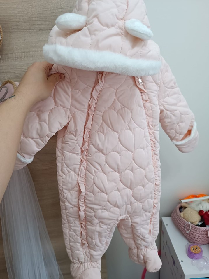 Pastel pembe renkte, kürklü kapüşonlu ve çıtçıtlı bebek kış tulumu. Yumuşak ve sıcak dokulu, desensiz tasarım.