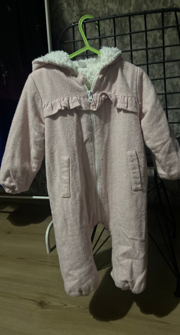 Pastel pembe renkte, kürklü detaylı ve yakası kesimli bebek tulumu. Fermuarlı, cepli ve yumuşak sıcak kumaş kullanılmıştır. ❄️