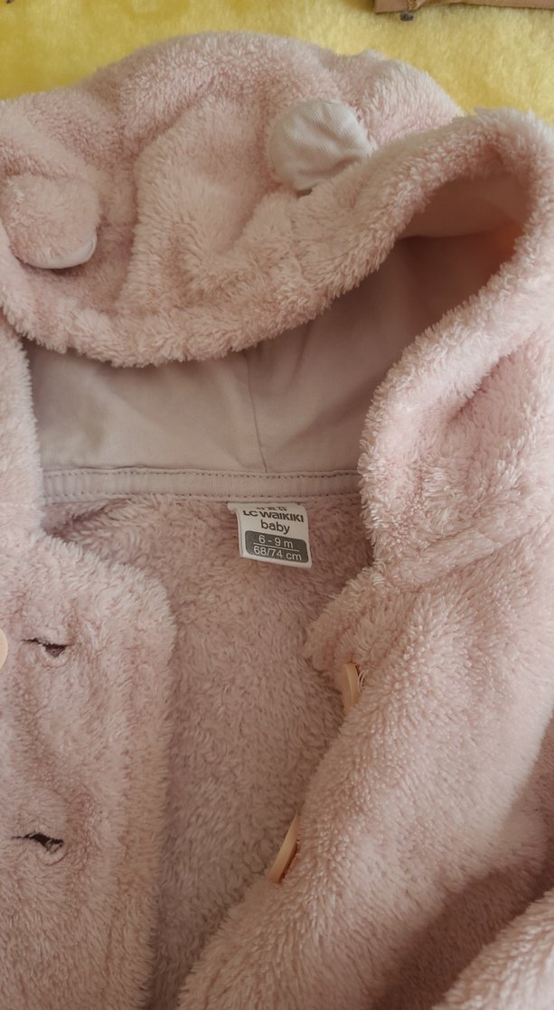 Pastel pembe renkli, kürklü detaylara ve kesimli yaka modeline sahip yumuşak bebek tulumu.❄️