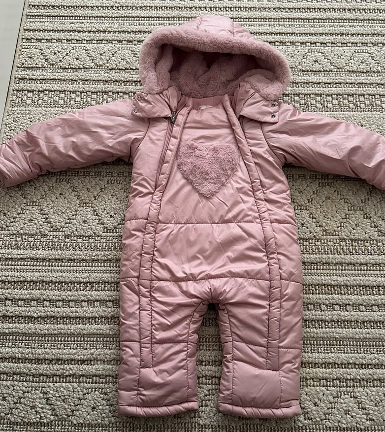 Kürklü detaylara ve nakışlı kalp desenine sahip pastel pembe bebek tulumu. Çentikli yaka ve yumuşak, sıcak kumaş kapüşon içerir. ❄️