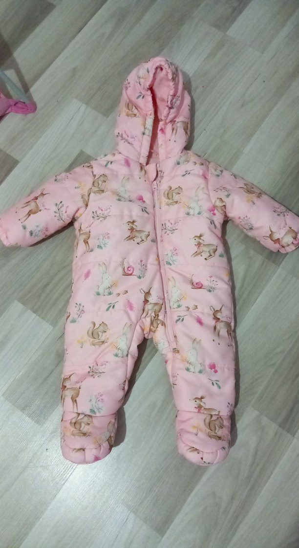 Pastel pembe renkte, desenli ve kürk detaylı, yakası kesik bebek tulumu. Sıcak tutar ve konfor sağlar. ❄️