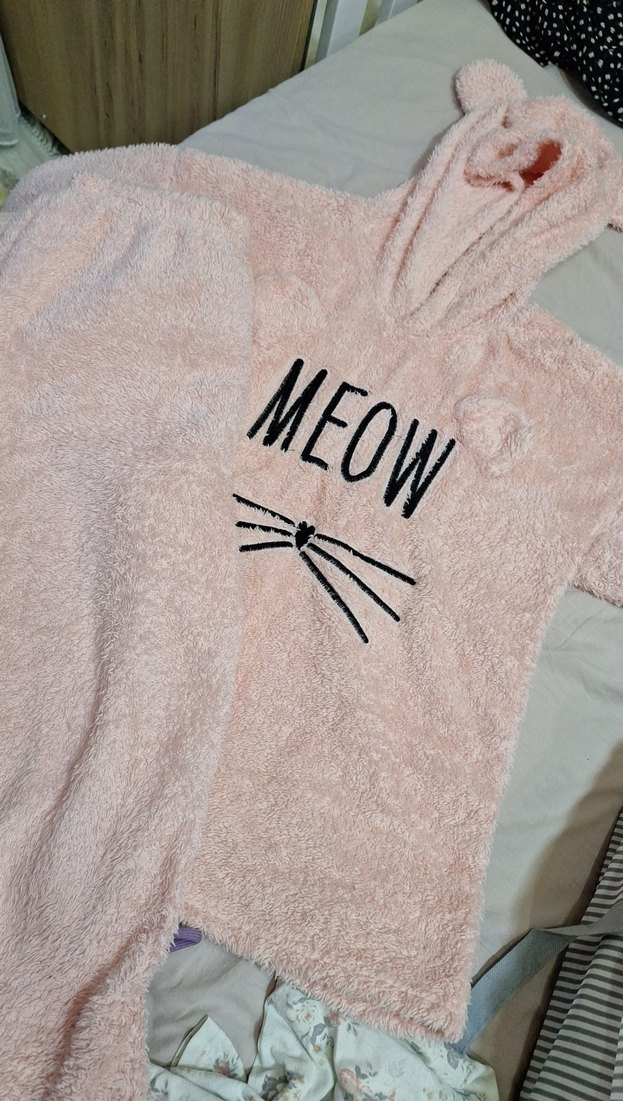 Kürklü, pembe renkte, "MEOW" yazılı ve bıyık desenli kapüşonlu kedi tulumu.