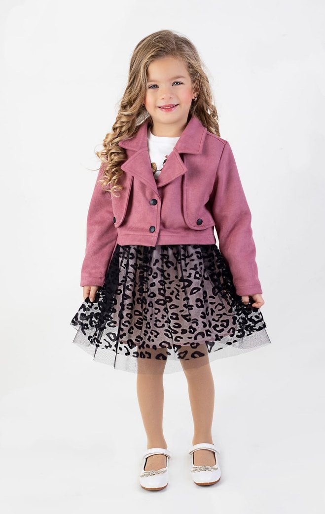 Kız çocukları için, uzun kollu, notched lapel yaka ve kürklü detaylara sahip, yumuşak süet kumaştan yapılmış pembe bolero. Rahat kesimli ve trendy tarzda.