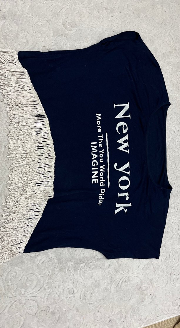 Bol kesim, kısa kollu larcivert kazak, kürk detaylı ve "New york" baskılı. Kayık yaka ve püsküllü etek ucu ile rahat bir sokak stili sunar.