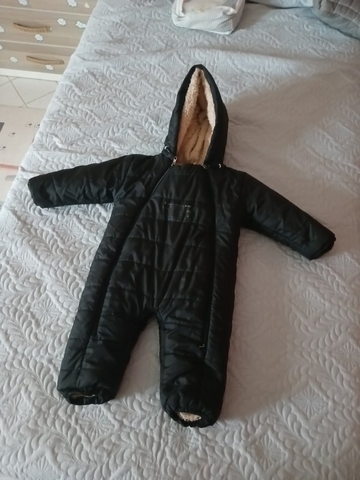 Siyah bebek kayak tulumu, kapüşonunda kürk detaylı ve yumuşak iç yüzeyiyle sokak modasına uygun rahatlık sağlar. ❄️