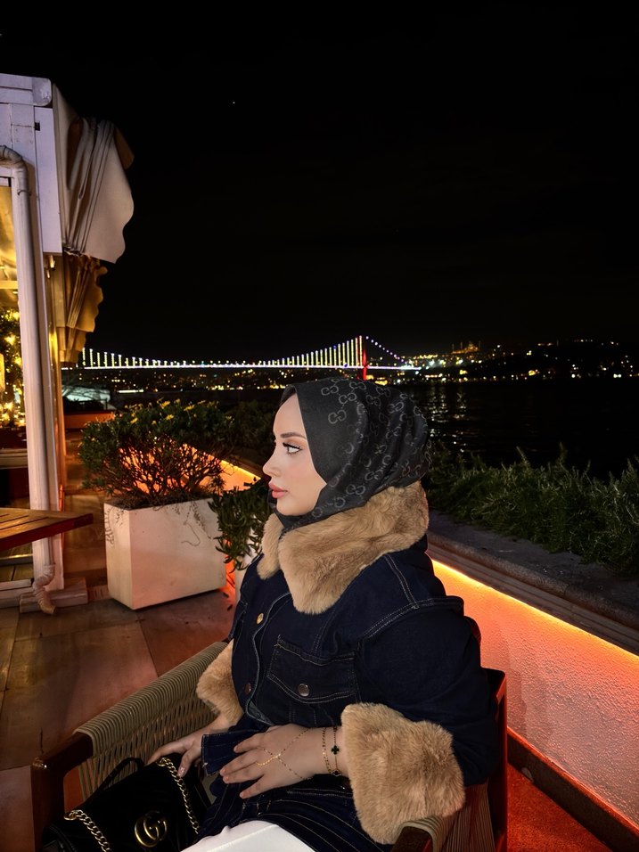 Kürklü yakası ve kollarıyla detaylandırılmış, yüksek yakalı, askılı kollu, etnik desenli siyah denim ceket. Günlük sokak stiline uygun midi boyda. 38/42 uyumlu