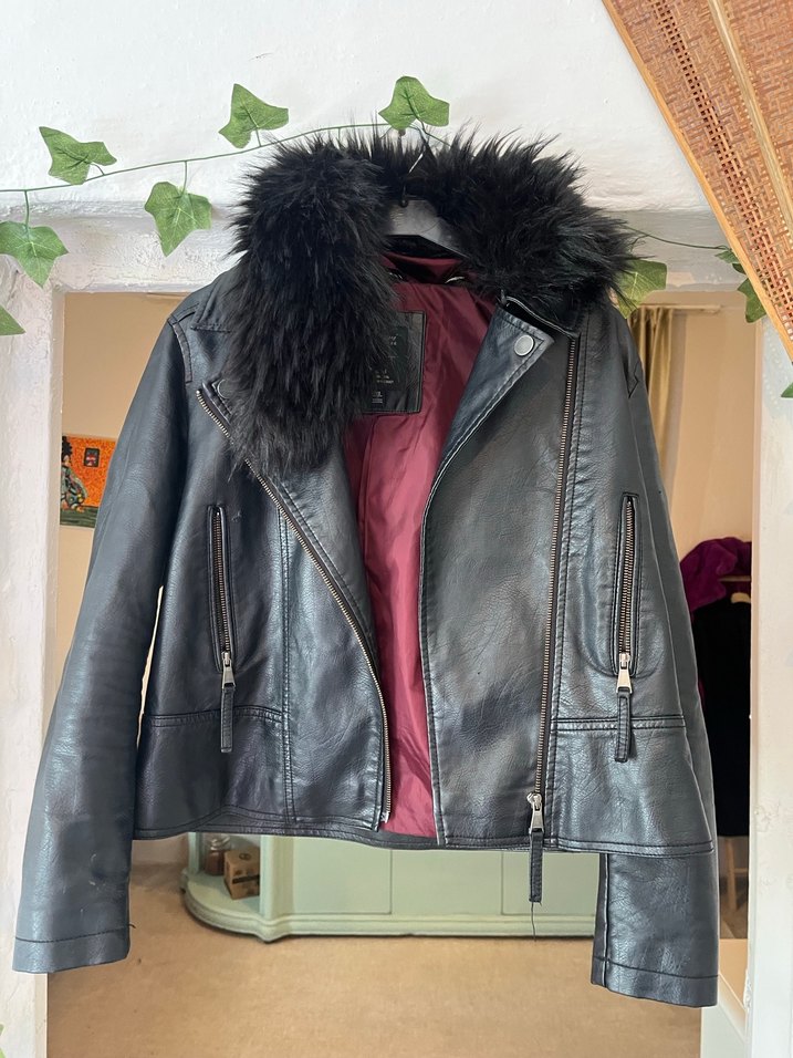 Siyah deri biker ceket, kürklü yaka detayı, dar kesim ve askılı kollara sahip. Normal midi boyunda, yakalı ve rock punk tarzına uygun. Fakat bazı kusurları mevcuttur deride fotoğraflarda mevcuttur lütfen ona göre yazınız beden olarak xs yazıyor fakat s ve m tercihtedir