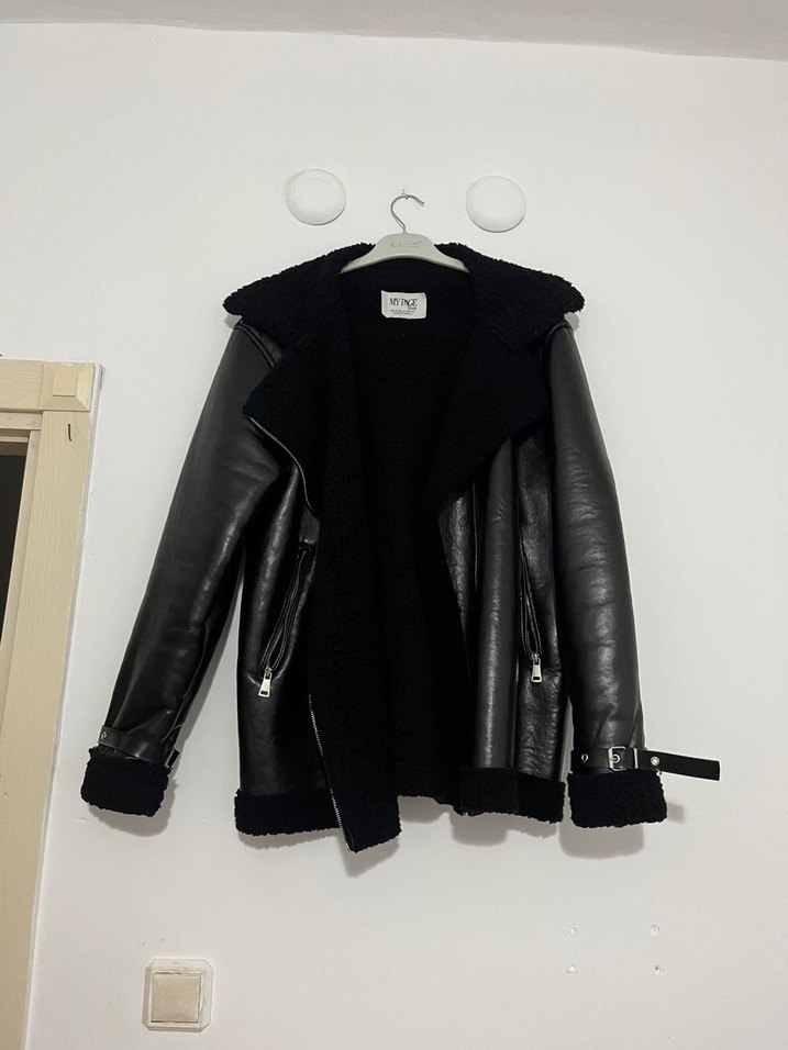 Kürklü detaylara sahip, siyah deriden yapılmış, kesimi vücuda oturan biker ceket. Notlu yaka ve askılı kollara sahiptir, midi boydadır.
