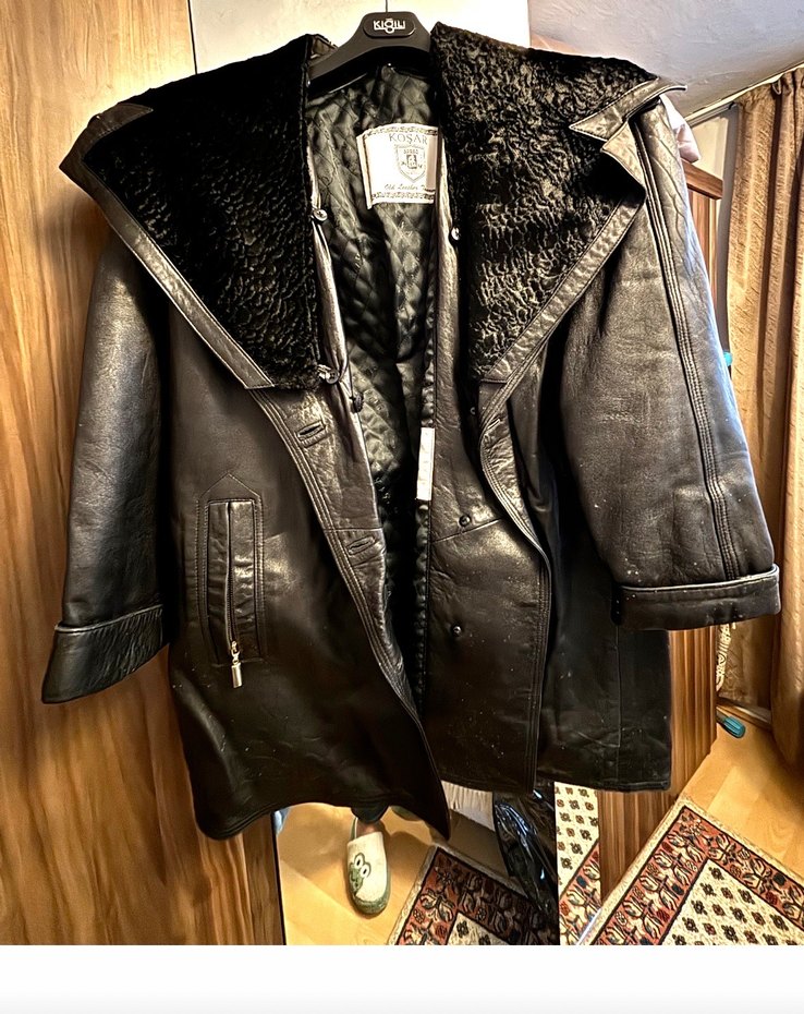 Bu siyah deri biker ceket, kürklü yakası ve askılı kollarıyla Paris tarzı, normal midi uzunlukta ve dar kesimdir.