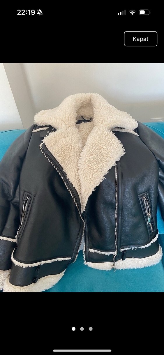 Kürklü detaylı, siyah deri biker ceket. Notalı yaka, strappy kollu, normal midi boy, günlük kullanıma uygun.