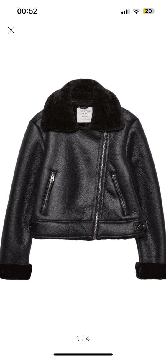 Siyah deri biker ceket, kürklü yakası ve manşetleri, strappy kollu ve normal boyda. Fermuarlı cepleriyle sade ve şık tasarım sunar.
