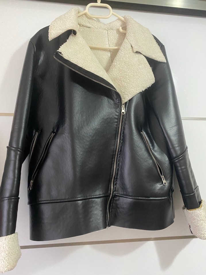 Parlak siyah deri, kürklü detaylı yakası ve kayışlı kollarıyla trend biker ceket. Orta boy ve vücuda oturan kesimiyle rahat kullanıma uygun kollarının iç kısmında paylaştığım resimdeki gibi soyulmalar mevcut olan göre alım yapınız