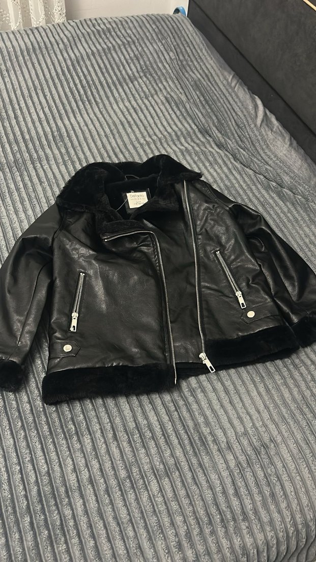 Kürklü detaylara sahip siyah deri biker ceket, yaka ve cep fermuarlarıyla rock punk tarzına uygun, normal kesim ve deseniz.