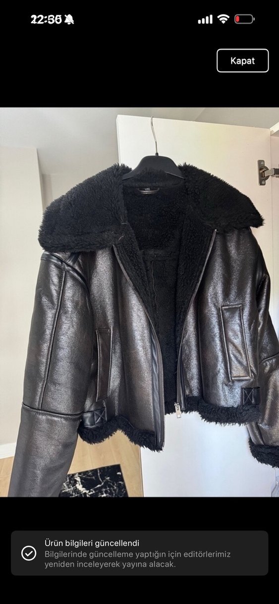 Kürk detaylı siyah deri, fitted kesim kadın ceket. Notch yaka ve askılı kollarıyla midi boy, goth Paris tarzı günlük kullanıma uygun. hiç giymedim