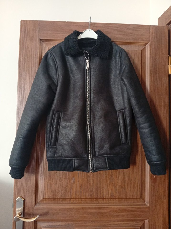 Kürklü yakalı, siyah deri erkek ceket. Notched lapel yakası ve uzun kollu, regular kesim midi boyda, sokak stili için uygun.
